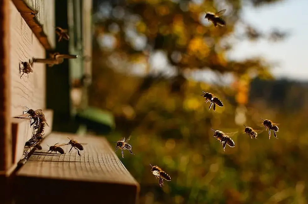 • Swarming bees → gather in front of the hive, then rise in a cloud before moving off.